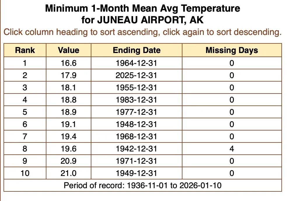 Juneau brach im Dezember langjährige Schneefallrekorde, wobei die Gesamtmenge so extrem war, dass fast die gesamte Schneemenge eines ganzen Winters in einem einzigen Monat fiel. Fairbanks verzeichnete neben seiner historischen Kälte ebenfalls ungewöhnlich starke Schneefälle.
