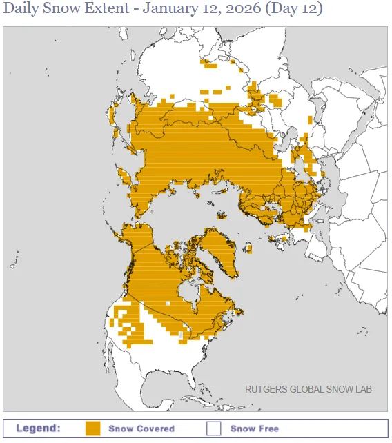 Einschub des Übersetzers hierzu: Hier folgt die derzeitige Verteilung der Schneedecke auf der Nordhemisphäre (Quelle):