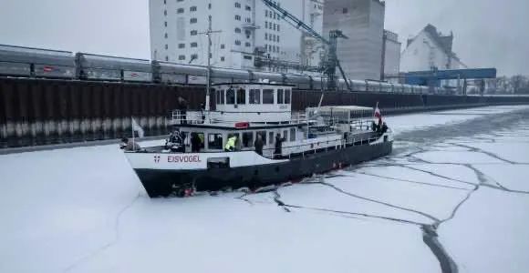 Der Eisbrecher MS Eisvogel wurde zurückgerufen und räumt täglich das Eis aus den Häfen von Freudenau, Albern und Lobau.