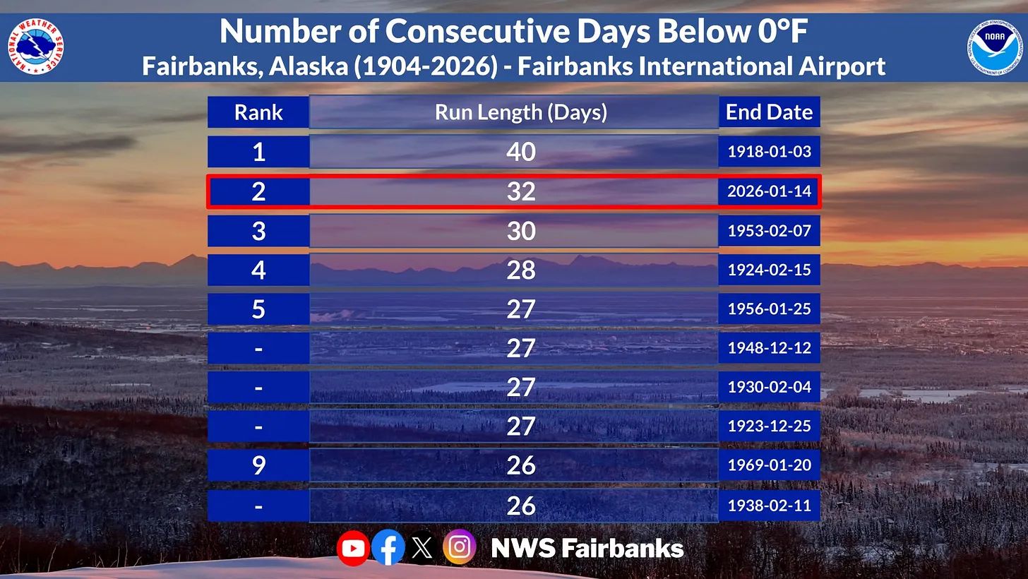 Am Donnerstag um 19:30 Uhr stieg die Temperatur in Fairbanks zum ersten Mal seit 32 Tagen offiziell auf -17,8 °C. Damit ist dies nun die längste ununterbrochene Periode mit Temperaturen unter null Grad [Fahrenheit!] in Fairbanks seit 108 Jahren, nämlich seit der 40-tägigen Kälteperiode, die am 3. Januar 1918 endete: