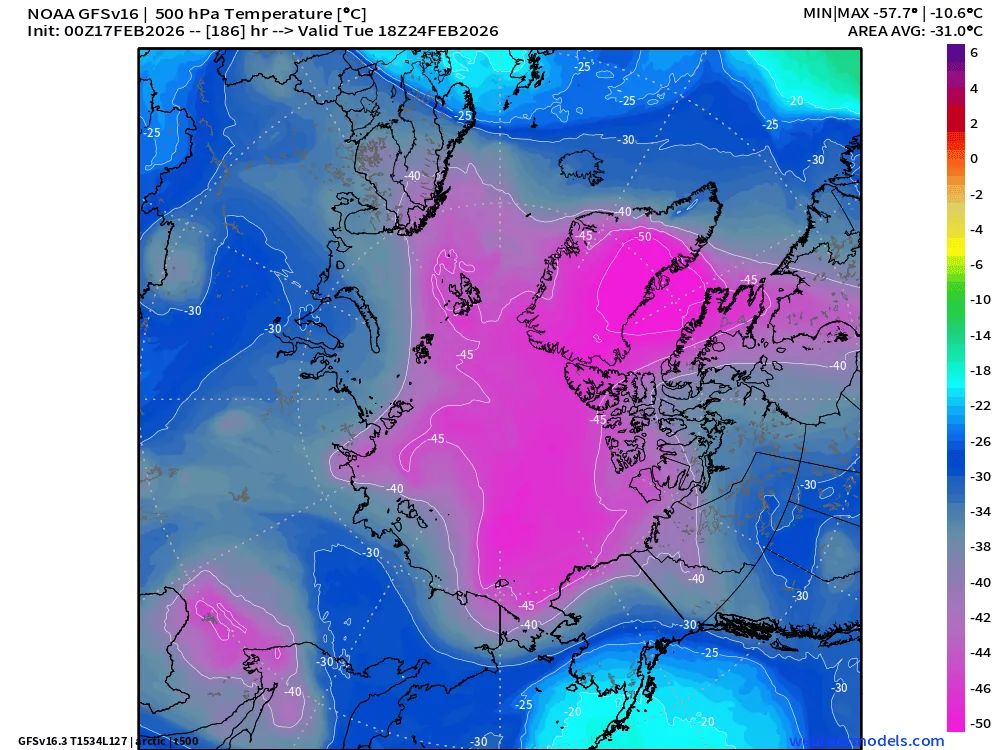 Karten zeigen Temperaturen von 500 mb nahe -58 °C, was fast dem niedrigsten Wert entspricht, der über der Arktis möglich ist.