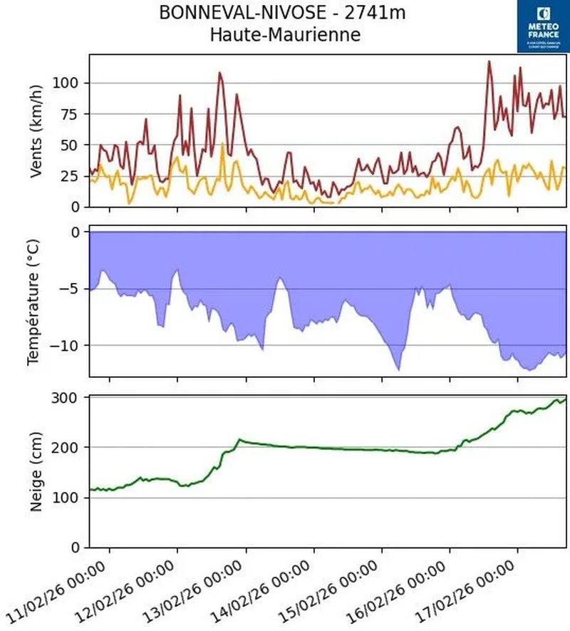 In Bonneval-sur-Arc erreichte die Schneehöhe am 17. Februar auf 2.741 m 294 cm. Dies ist die höchste Schneedecke vor März, die dort seit Beginn der Aufzeichnungen im Jahr 1996 gemessen worden ist.