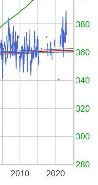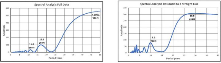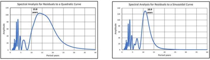 Abbildung 44 weist auf den untersuchten 29-Jahre-Zyklus und erneut auf einen Peak um 10 Jahre hin. Wie oben erwähnt, wird dieser auf der Grundlage einer geraden Linie erhalten und entstand bei der Beurteilung der Verwendung der quadratischen Kurvenanpassung und der damit verbundenen Extrapolation. Als Alternative wurde die sinusförmige Kurvenanpassung untersucht, worüber in einer Reihe von Artikeln berichtet wurde, zuletzt hier, der den Zeitraum bis Ende 2024 abdeckt.