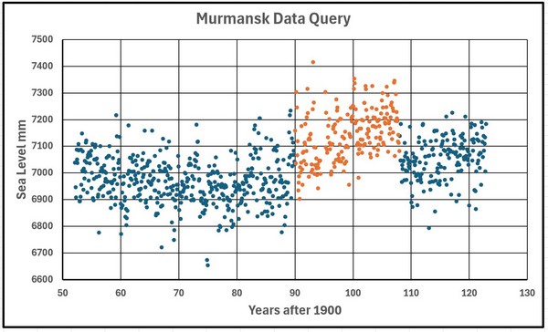 Abbildung 25 zeigt die Murmansk-Daten (ungefähr 8-Jahres-Gleitender Durchschnitt), wobei nur die längste Periode dargestellt ist. Die beiden kurzen Perioden werden nicht gezeigt, da die seltsamen Daten zwischen 1990 und 2010 den Plot stark beeinflussen. Die verwendeten Verschiebungen (SHIFT1, SHIFT2 und SHIFT3) sind (-45, -20 und -100).