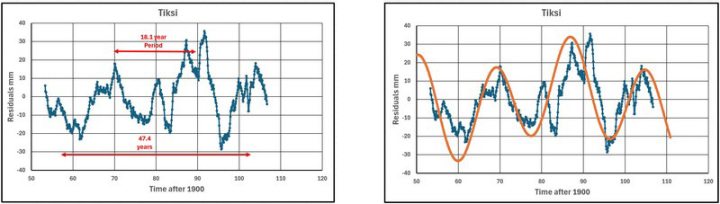 Die allgemeine Schlussfolgerung lautet, dass die 29-jährige Schwankung mit der linearen Anpassung zusammenhängt, aber es gibt eine allgemeine Schwankung von etwa 18 Jahren in allen Gezeitendiagrammen, die in den vollständigen Satellitendaten zu sehen ist.