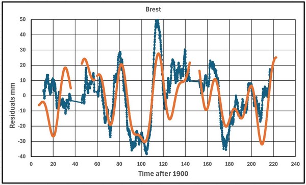 Die Daten aus Brest decken den Zeitraum von 1807 bis 2022 ab, also einen Zeitraum von 216 Jahren. Abbildung 10 zeigt die Spitzenwerte der Spektralanalyse für die Residuen.