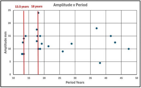 Die Signifikanz des 18-Jahre-Zyklus‘ lässt sich anhand der Amplituden und Perioden jeder Gruppe von Sinuskurven nachvollziehen, wie in Abbildung 23 (plus Murmansk) dargestellt. Es gibt zwei Cluster. Einer mit einer Periode von 13,5 Jahren, an dem 6 der 9 Kurven beteiligt sind, und einer mit einer Periode von 18 Jahren, an dem 8 der 9 Kurven beteiligt sind, wobei der 9. Wert 21,4 Jahre beträgt. Die zweite Gruppe entspricht dem 18-Jahres-Zyklus in Abbildung 36.