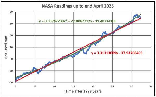Zunächst wurden die neuesten Daten der NASA geprüft. Leider gab es aus politischen Gründen eine Unterbrechung und zuvor einen Rückgang der Menge der veröffentlichten verarbeiteten Daten. Daher werden die Daten vom April 2025 verwendet, da dies der letzte Datensatz mit einer vollständigeren Form der Daten ist, den ich seit Beginn im Jahr 2018 analysiert und veröffentlicht habe. Abbildung 38 zeigt die Daten vom April 2025, auf die am besten passende lineare und quadratische Kurven angewendet wurden: