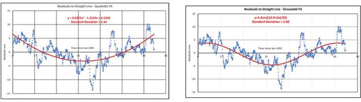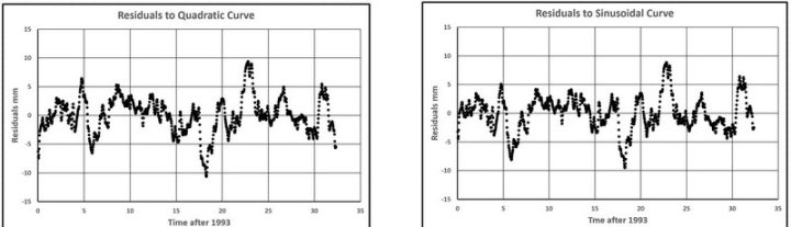 Anlass für diese Arbeit war die sinusförmige Schwankung im Bereich von 26 bis 29 mm/Jahr2, die bei der Untersuchung von NASA-Satellitendaten festgestellt wurde. Diese Schwankung wurde für die Residualwerte bestimmt, die aus der linearen Bestfit-Anpassung der Daten berechnet wurden. Die Ergebnisse der Gezeitenpegel beziehen sich auf die Residuen, die aus einer quadratischen Kurve über den gesamten Datensatz berechnet wurden. Über den kurzen Zeitraum (33 Jahre) der Satellitendaten wurde angenommen, dass die Abweichung der besten Anpassung von einer geraden Linie minimal ist, aber mit zunehmender Dauer der Satellitenbeobachtung könnte es wichtiger werden, dies zu berücksichtigen.