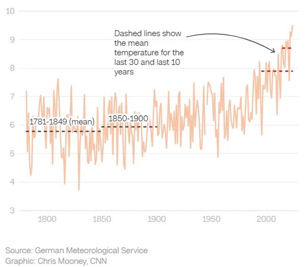 Nach etwa 2000 ist eine starke Erwärmung zu beobachten, aber dieser spätere Anstieg lässt sich nur schwer auf natürliche Faktoren zurückführen, nicht zuletzt auf CO₂, dessen Konzentration seit Beginn der Aufzeichnungen stetig gestiegen ist (d. h. ohne starke Anstiege). Was zeitlich übereinstimmt, ist die Veränderung der umgebenden Landschaft. Früher ländlich geprägte Stationen wie Hohenpeissenberg haben eine zunehmende Bebauung, neue Infrastruktur, veränderte Vegetation und eine erhöhte Wärmespeicherung durch Gebäude und befestigte Flächen (d. h. den städtischen Wärmeinseleffekt) zu verzeichnen.