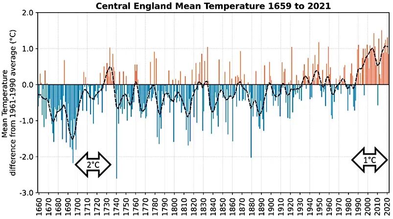 Die frühere Historie zeigt Gleiches. Die Temperaturaufzeichnungen für Mittelengland (unten) zeigen das Ende des Maunder-Minimums (1645–1715). Die Aufzeichnungen zeigen einen Anstieg um 2 °C von 1695 bis 1735 (doppelt so viel wie die heutige Erwärmungsrate!), lange vor den industriellen Emissionen: