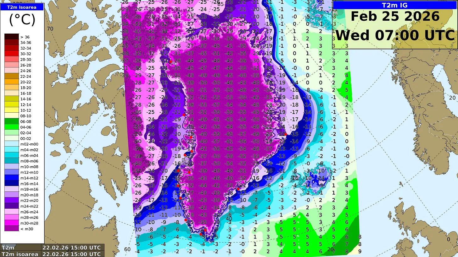 Alle Augen bleiben auf Grönland gerichtet, wo im Laufe der Woche Rekordkälte möglich ist.