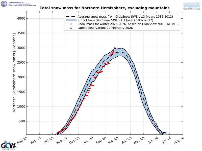 All dieser Schnee hat zur Masse der nördlichen Hemisphäre beigetragen, die nach einem langsamen Start nun über dem Durchschnitt von 1982-2012 liegt: