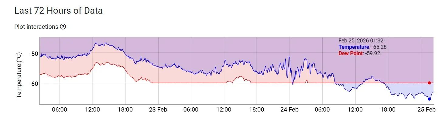 Summit verzeichnete gerade eine Tiefsttemperatur von -65,3 °C, nur 2 °C unter dem Februar-Rekord der Station.