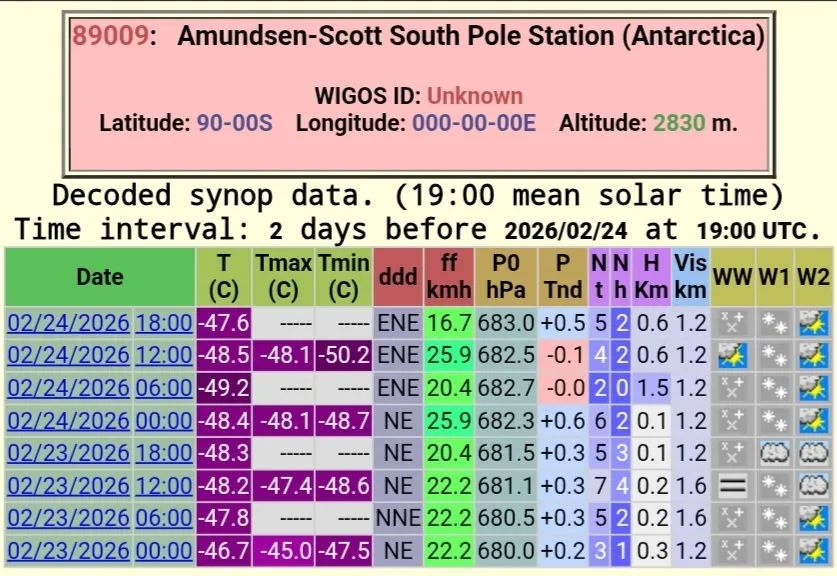 Am 24. Februar verzeichnete die Südpolstation erstmals in dieser Saison Temperaturen unter -50 °C: