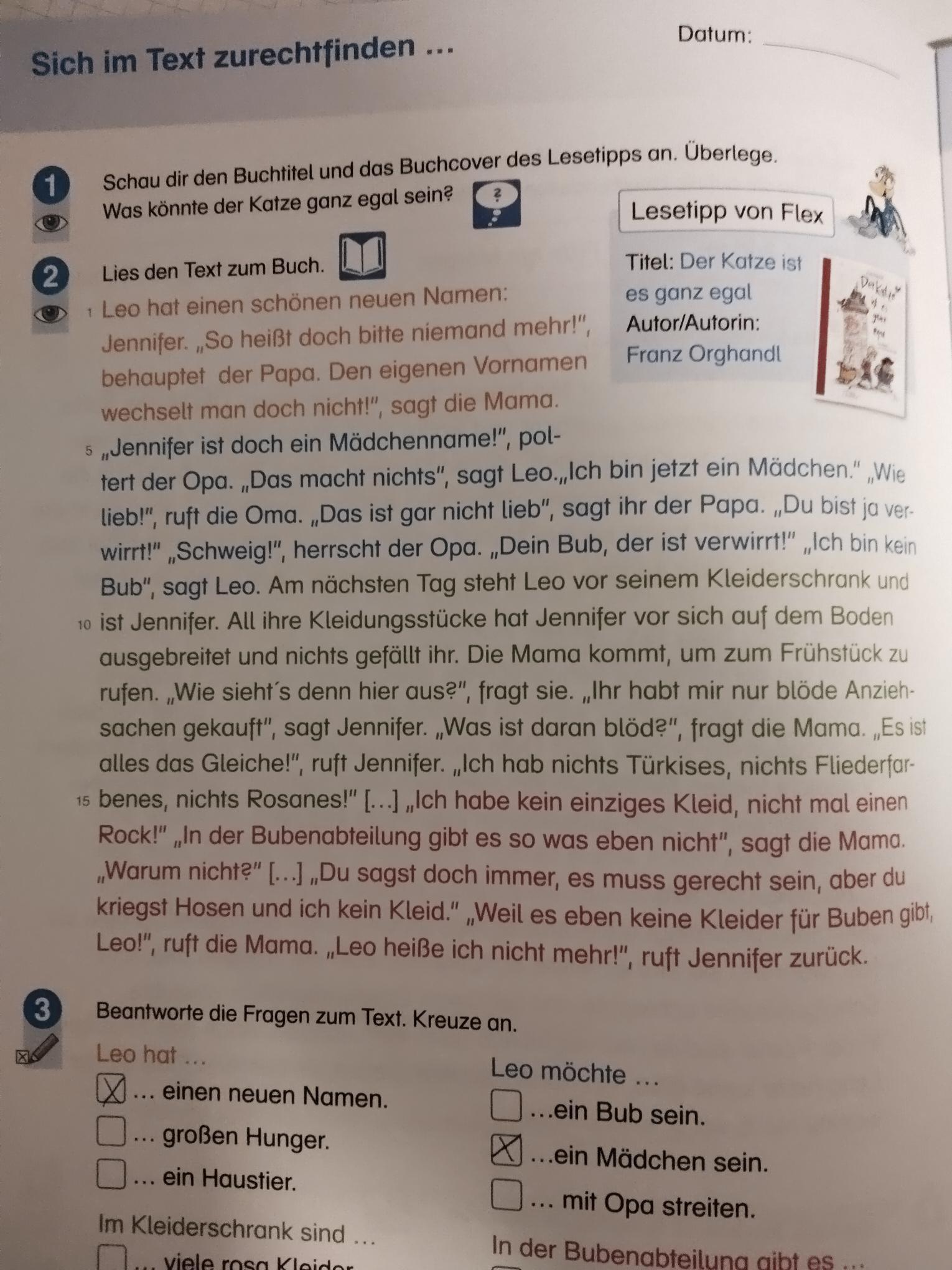 Im Schulbuch geht es um Aufgabenstellungen zum Buch “Der Katze ist es ganz egal von Franz Orghandl”. Was man am Namen des Autors vielleicht nicht gleich erraten konnte – bei Orghandl handelt es sich um eine Frau aus Wien. Für das LGBTQ-Standardwerk “Der Katze ist es ganz egal”, erschienen im Klett-Verlag 2020 wurde sie mit dem Österreichischen Kinder- und Jugendbuchpreis 2021 ausgezeichnet. Der Klappentext erklärt: