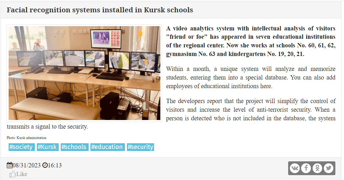 Erinnern wir uns daran, dass Vize-Premierminister Dmitri Grigorenko im August betonte, wie wichtig es sei, alle Schulkinder mit einer Kennzeichnung zu versehen, und argumentierte, dass „der Zugang zur Schule ‚per Gesichtserkennung‘ nicht nur bequem, sondern auch sehr sicher ist“.