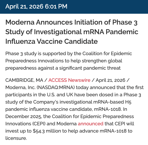 Im Zuge einer massiven Beschleunigung der Orchestrierung einer Vogelgrippe-Pandemie und der Infrastruktur für Massenimpfungen gab Moderna, Inc. gestern bekannt, dass „die ersten Teilnehmer in den USA und Großbritannien im Rahmen einer Phase-3-Studie des experimentellen mRNA-basierten H5-Pandemie-Influenza-Impfstoffkandidaten des Unternehmens, mRNA-1018, behandelt wurden.“