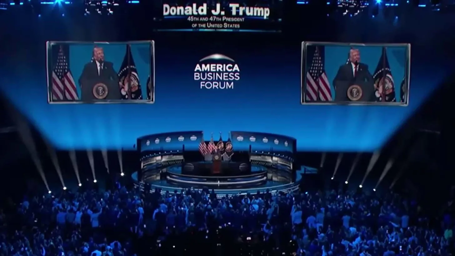 Donald Trump spricht auf dem America Business Forum 2025 in Miami, Florida