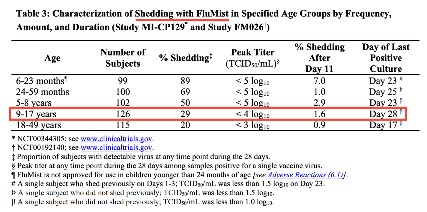 Ein weiterer verbreiteter Grippeimpfstoff ist FluMist, dessen FDA-Beipackzettel ausdrücklich bestätigt, dass er ein lebendes Virus verwendet, das mindestens 28 Tage nach der Impfung über Körperflüssigkeiten ausgeschieden werden kann und mit PCR-Tests nachweisbar ist.