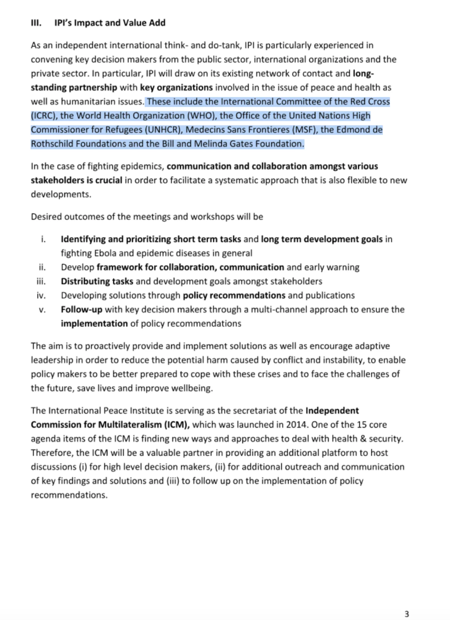 Die Edmond de Rothschild-Stiftungen – die in Genf und Luxemburg ansässige Privatbankendynastie, die in 27 Ländern tätig ist und ein Vermögen von rund 170 Milliarden Schweizer Franken verwaltet – sowie die Bill-und-Melinda-Gates-Stiftung wurden in der offiziellen Konzeptnotiz einer Konferenz, deren Budget von Jeffrey Epstein ausgehandelt wurde, als gleichberechtigte organisatorische Partner neben der WHO und dem IKRK genannt.