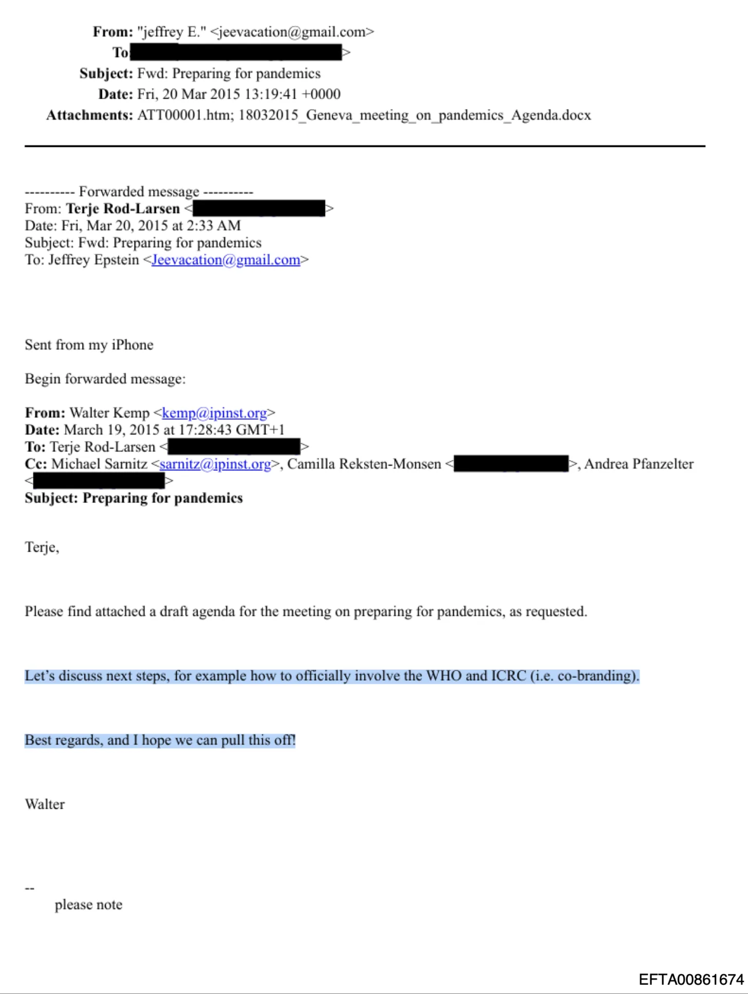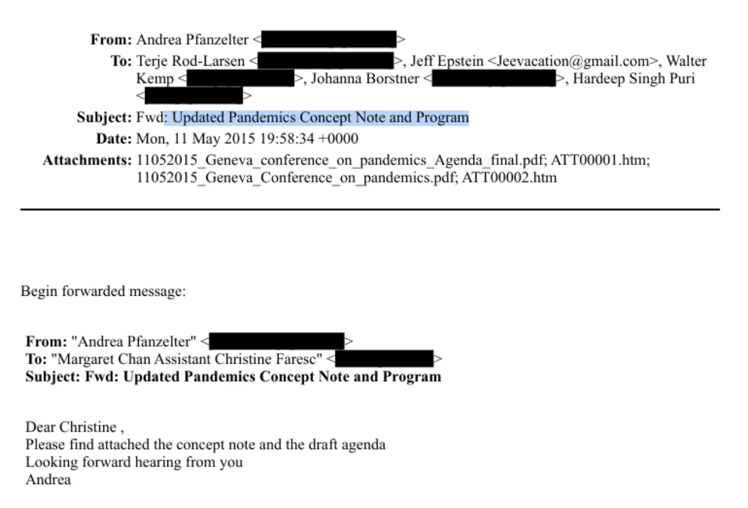 Am 11. Mai 2015 wurden die aktualisierte Konzeptnotiz und der Entwurf der Tagesordnung gleichzeitig an das interne IPI-Team – wobei Epstein direkt neben Rød-Larsen, Kemp und Puri in Kopie gesetzt wurde – sowie an Margaret Chans Assistentin bei der WHO verteilt. (EFTA00857205) Die WHO erhielt die Unterlagen zur Konferenzplanung über dieselbe Verteilerliste wie der verurteilte Sexualstraftäter, der die Finanzierung vermittelt hatte. Weder der öffentliche Titel der Konferenz noch die offiziellen Unterlagen der WHO enthielten darauf einen Hinweis.