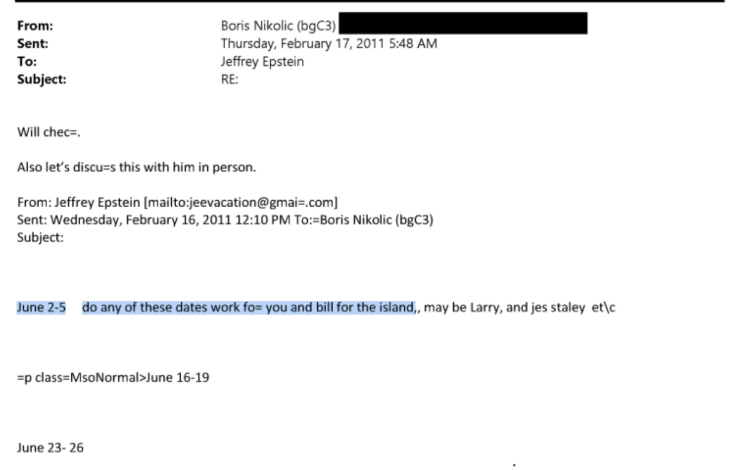 Im selben Monat lud Epstein Gates nach Little St. James ein – der privaten Karibikinsel, die Bundesstaatsanwälte später als Hauptschauplatz von Epsteins Menschenhandelsgeschäft identifizierten. Auf der vorgeschlagenen Gästeliste standen unter anderem JPMorgan-CEO Jes Staley und der ehemalige Finanzminister Larry Summers. Nikolic bestätigte, dass er Gates’ Verfügbarkeit prüfen würde. EFTA01786116