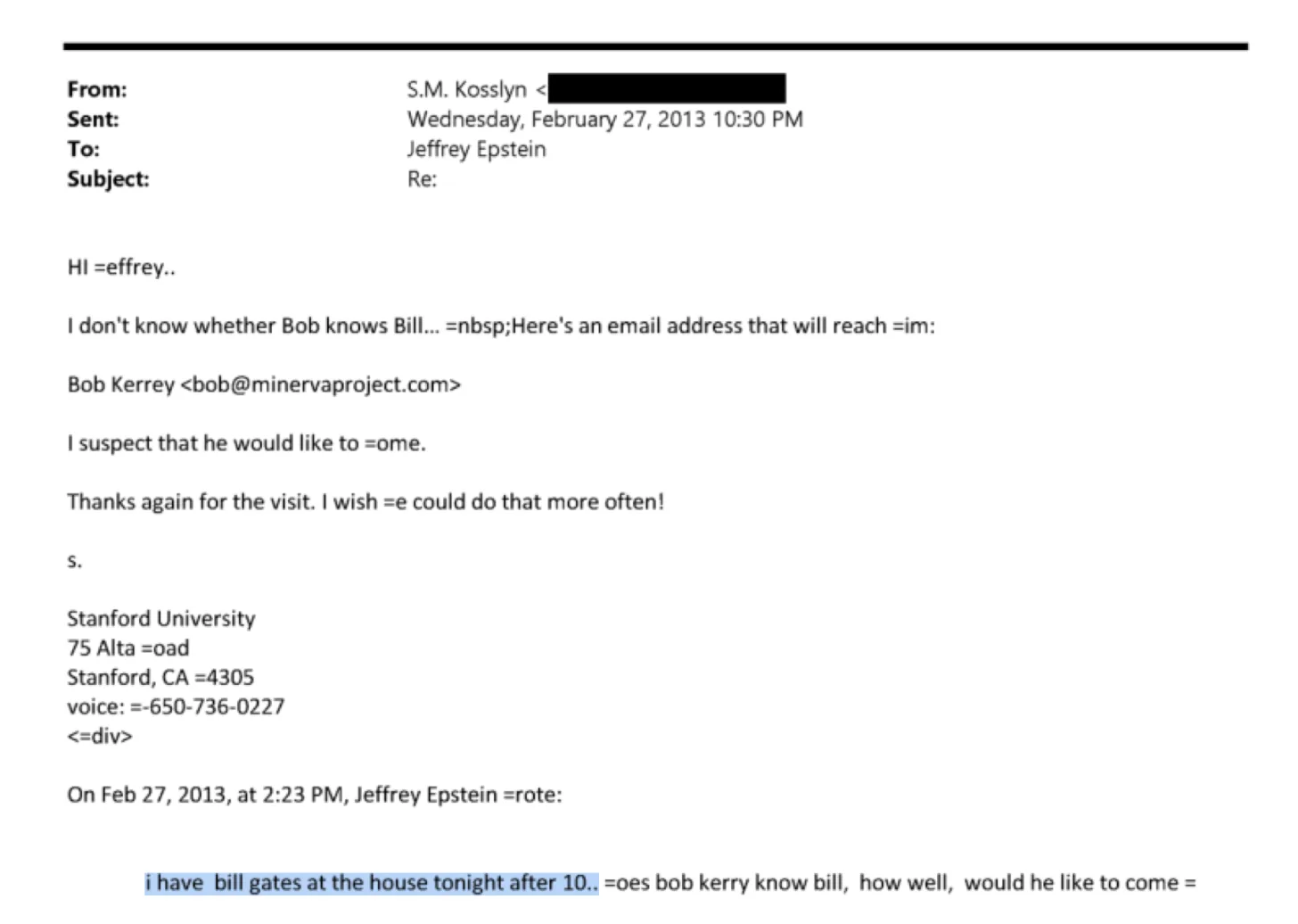 Am selben Abend – während er gleichzeitig die Hubschrauberlogistik und das Catering in Palm Beach koordinierte – schrieb Epstein an den Stanford-Neurowissenschaftler Stephen Kosslyn: „Ich habe Bill Gates heute Abend nach 22 Uhr im Haus … kennt Bob Kerry Bill, wie gut, würde er gerne kommen?“ Er suchte nach weiteren Gästen für ein spätabendliches Treffen mit Gates in seinem Haus. In Echtzeit. Von demselben Gmail-Konto aus. EFTA_R1_00066616