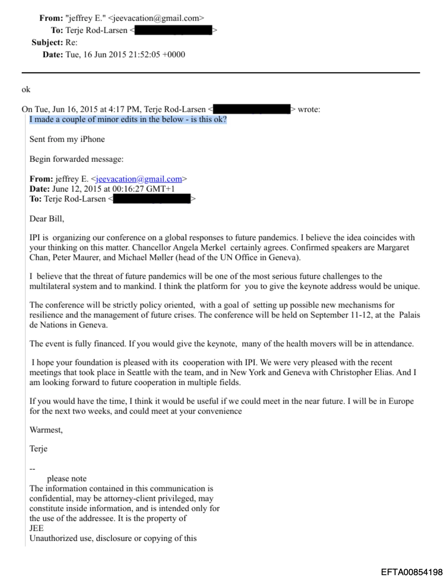 Das Schreiben, in dem der weltweit bekannteste private Gesundheitsphilanthrop gebeten wurde, auf einer Konferenz der Vereinten Nationen zum Thema Pandemiebekämpfung eine Grundsatzrede zu halten, wurde von Jeffrey Epstein verfasst, vor dem Versand von Epstein genehmigt und unter dem Namen eines anderen Mannes versandt.