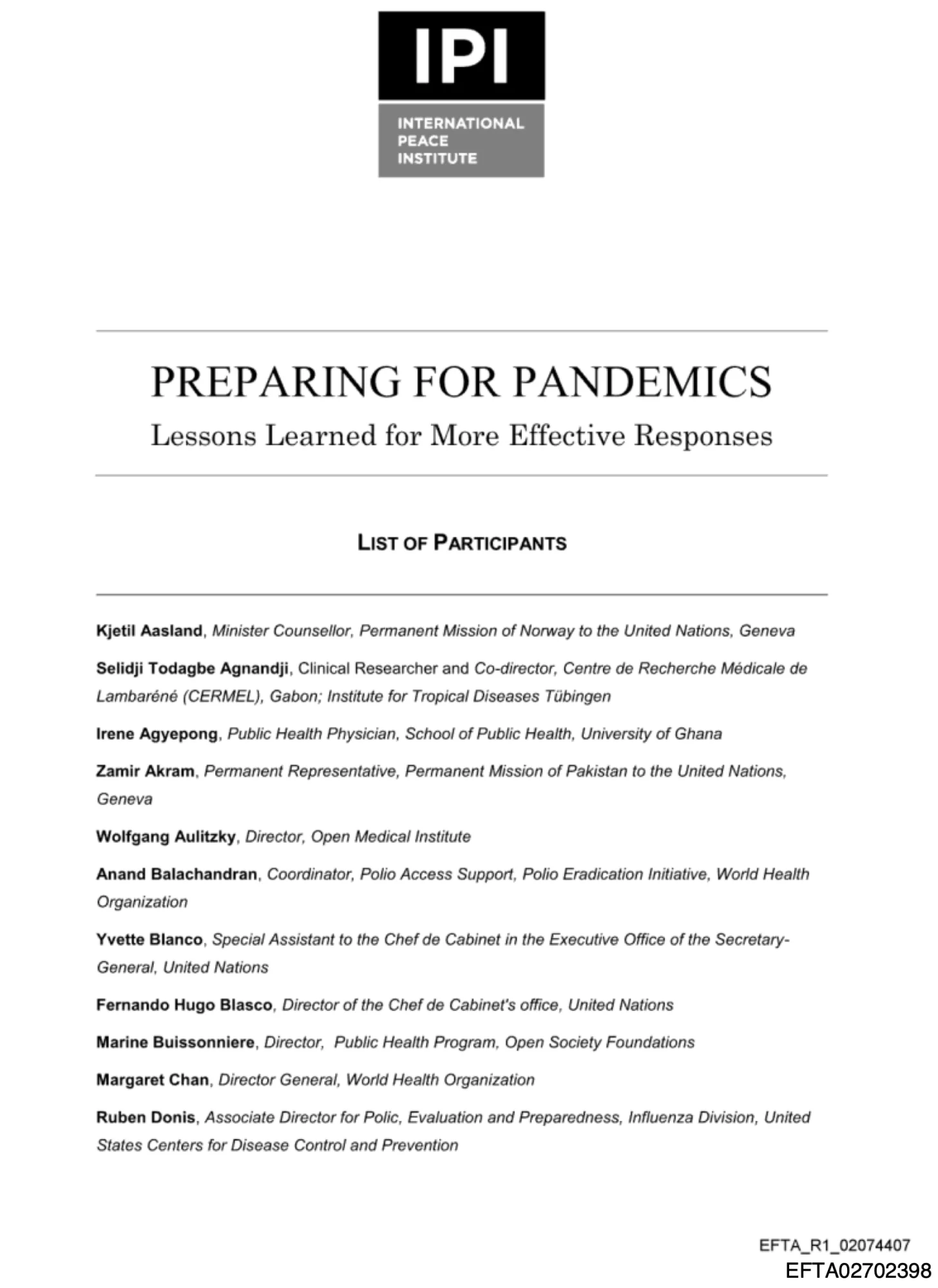 Er war nicht im Raum anwesend. Doch in den Planungsunterlagen, die an die Konferenzteilnehmer verteilt wurden – darunter auch an Margaret Chans Assistentin bei der WHO –, wurde er direkt neben der IPI-Führung aufgeführt. (EFTA00857205) Die Anwesenden im Raum hatten die Möglichkeit zu erfahren, wer die Veranstaltung finanziert und die Einladung zur Grundsatzrede verfasst hatte. Ob sie sich diese Informationen angesehen haben, ist eine andere Frage.
