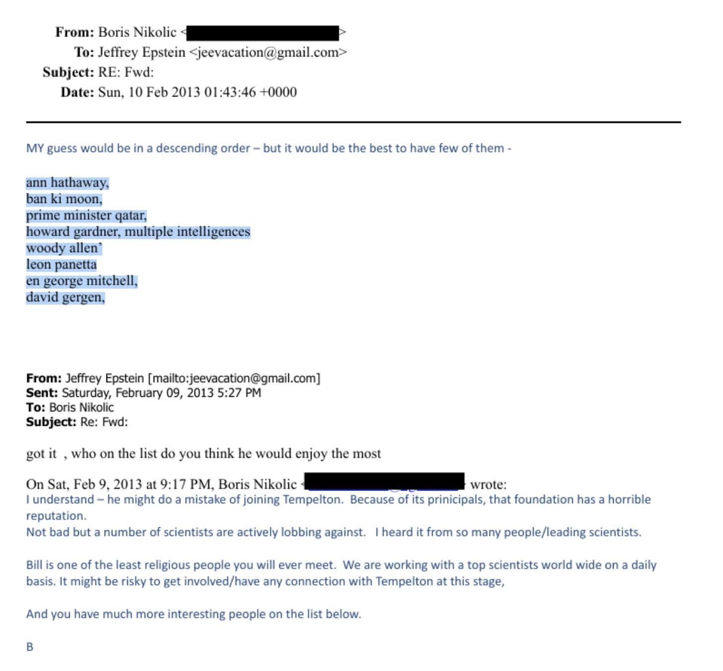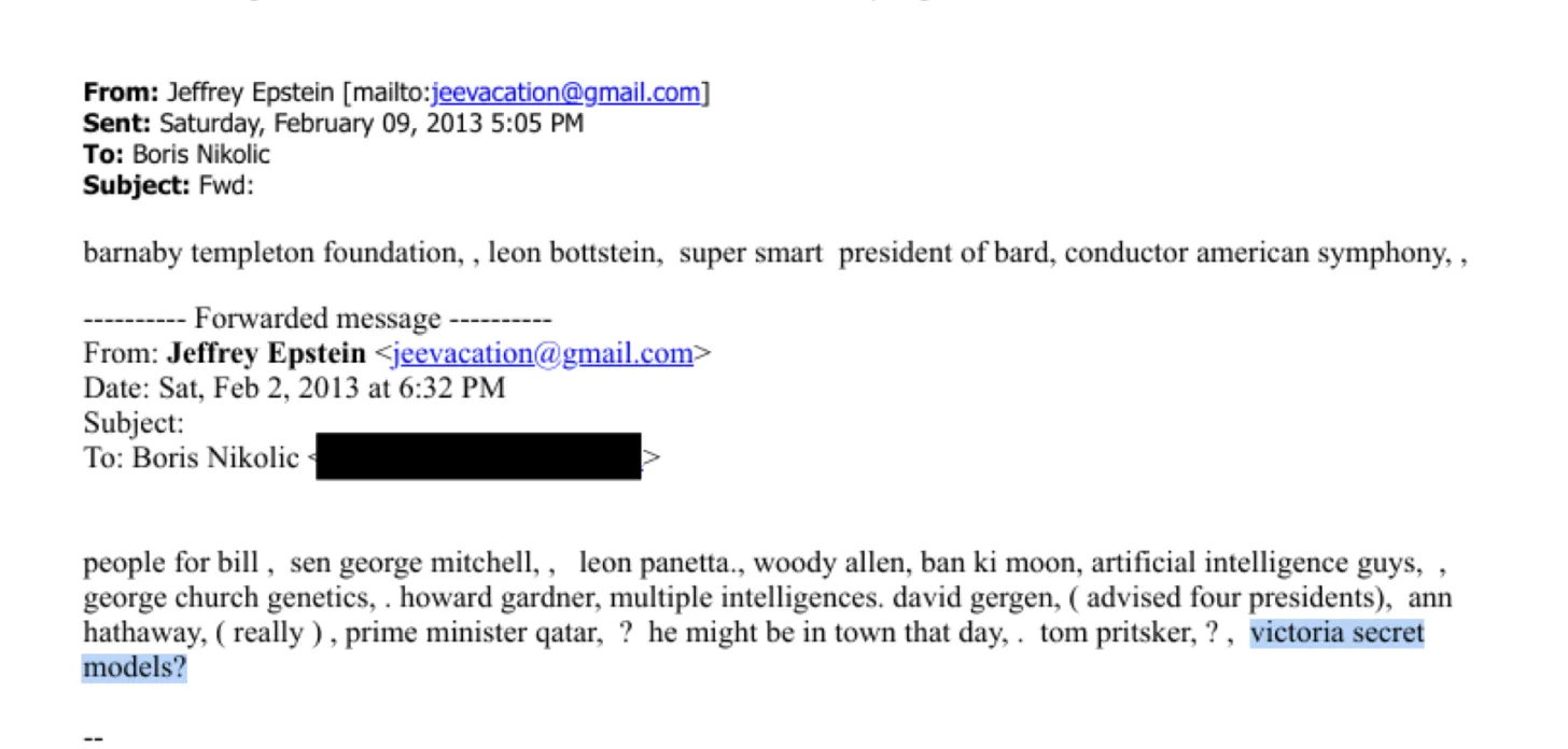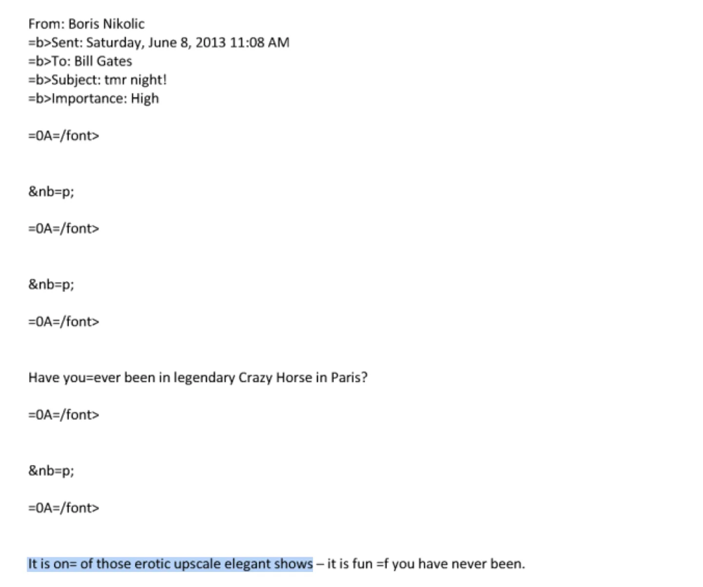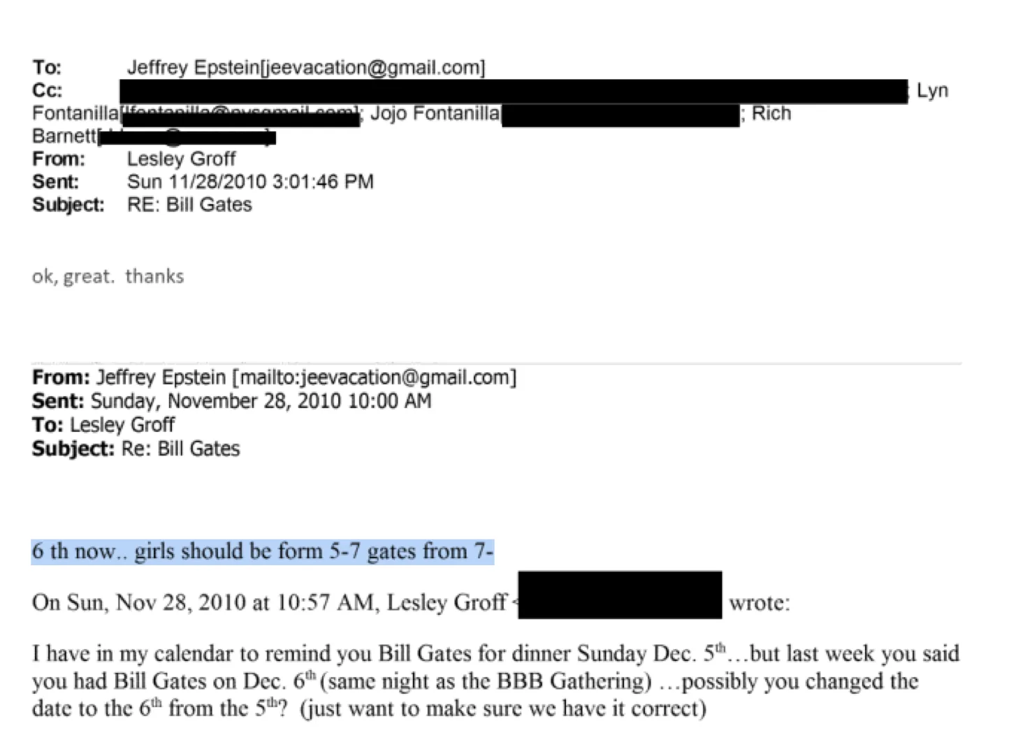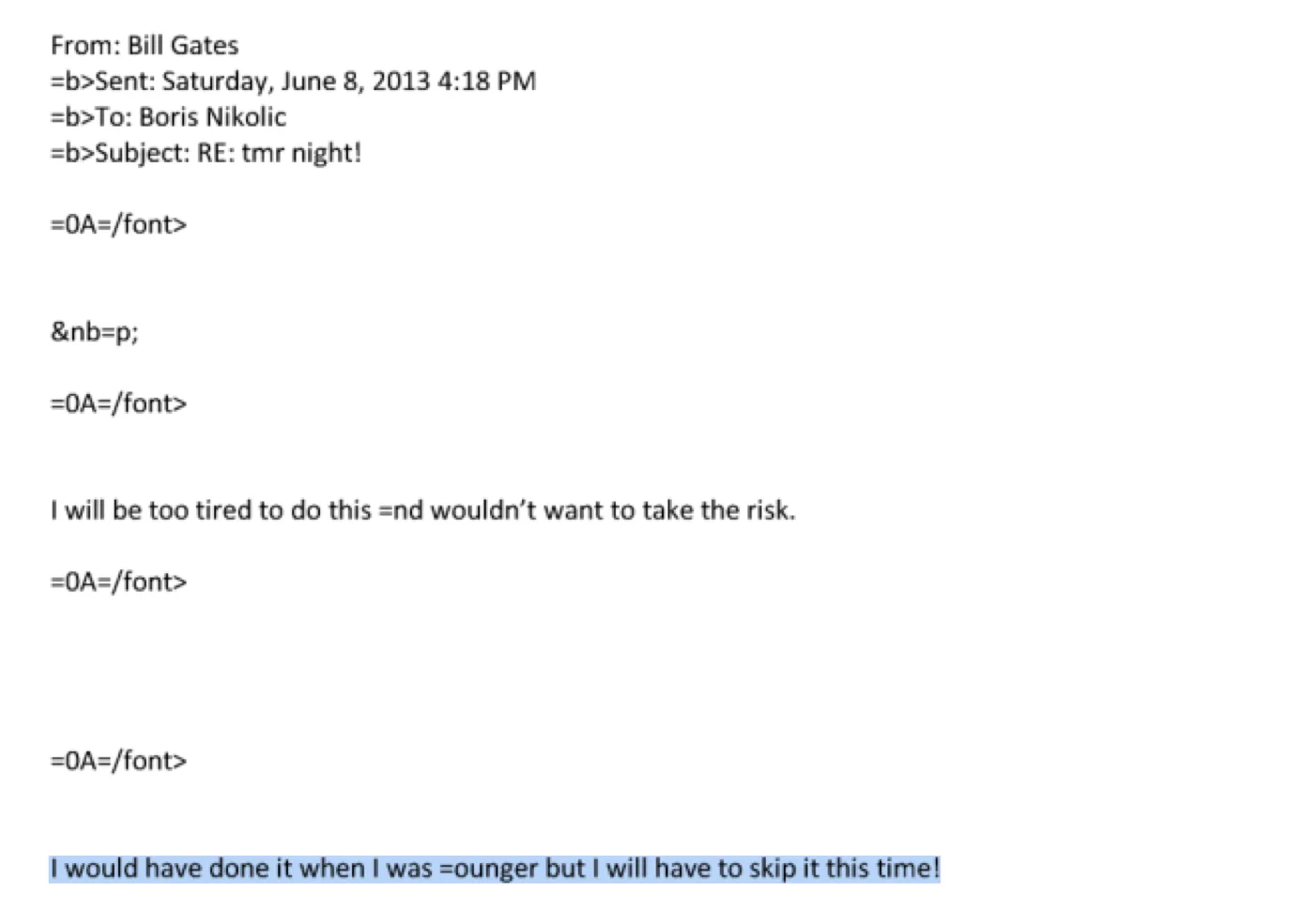Gates’ wissenschaftlicher Berater – der über Epsteins Netzwerk agierte – bot ihm Backstage-Zugang zu Darstellern an, mit denen Epstein ausgegangen war. Gates lehnte ab. In seiner Antwort bestätigte er unmissverständlich die Art der Einladung: „Als ich jünger war, hätte ich das gemacht.“