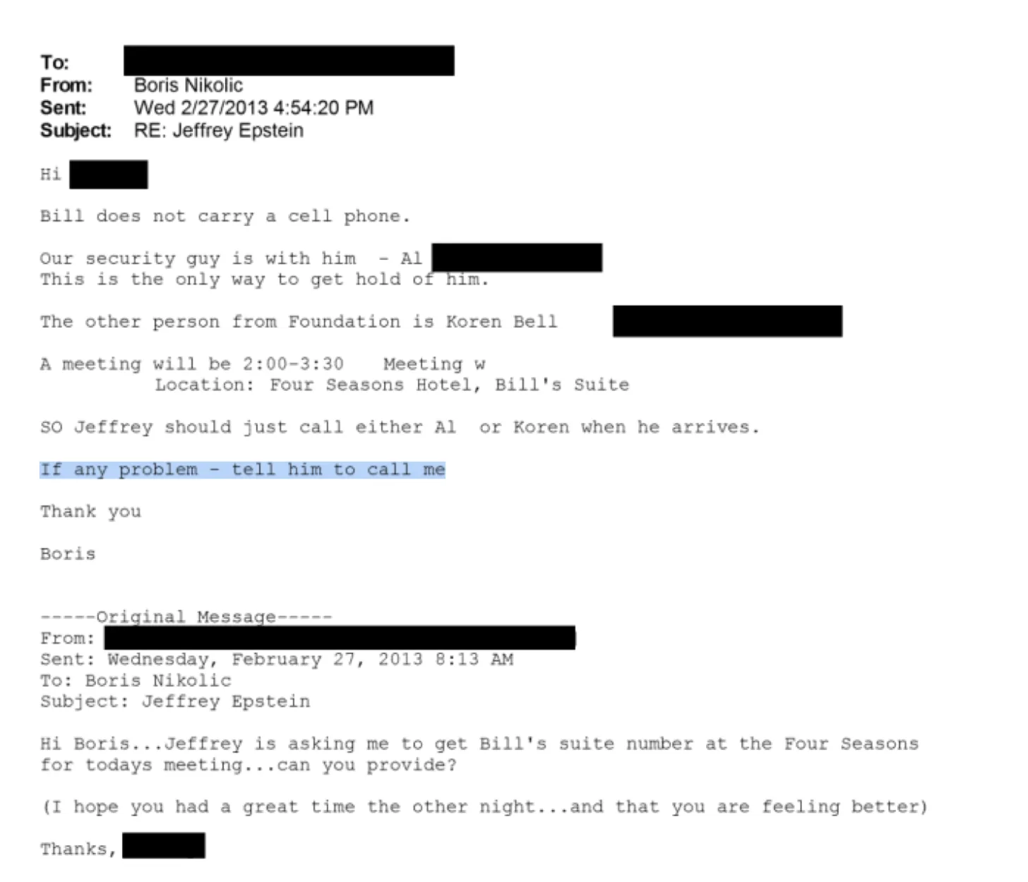Mittwoch, 27. Februar: Ein Ansprechpartner der Gates Foundation schickte eine E-Mail an Boris Nikolic – Gates’ Chefberater für Wissenschaft und Technologie in seinem privaten Büro bgC3 –, um die Vereinbarungen für diesen Tag zu bestätigen. Gates würde von 14:00 bis 15:30 Uhr im Four Seasons Hotel in seiner eigenen Suite sein. In der E-Mail wurde darauf hingewiesen, dass Gates kein Mobiltelefon bei sich trägt. Um ihn zu erreichen, musste man sich an seinen persönlichen Sicherheitsbeauftragten Al oder die Ansprechpartnerin der Stiftung, Koren Bell, wenden. Epstein sollte bei seiner Ankunft einen der beiden anrufen. „Bei Problemen – sag ihm, er soll mich anrufen.“EFTA_R1_00803718 / EFTA02145847