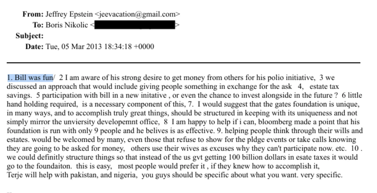 Vier Tage nach der Reise nach Palm Beach schrieb Epstein an Nikolic einen Bericht. Seine Zusammenfassung zu Gates: „Bill war unterhaltsam.“ Was folgte, war ein zehn Punkte umfassendes operatives Memo, in dem Rød-Larsen als Geheimdienstquelle für Pakistan und Nigeria benannt und Reformen zur Umstrukturierung von philanthropischen Spenden in Milliardenhöhe vorgeschlagen wurden. EFTA00955128