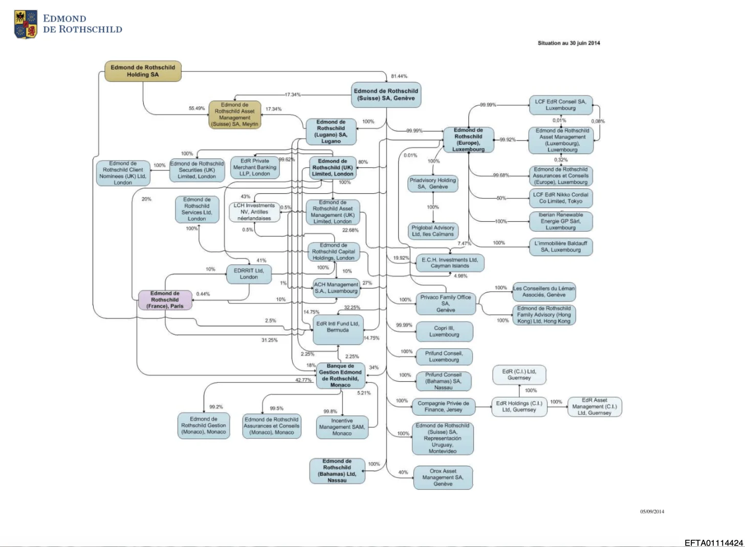 Doch die Bundesunterlagen enthalten auch etwas, das dieser Ankündigung vorausging. In Epsteins Akten befindet sich, ohne dass eine Übermittlungskette erkennen lässt, wer sie bereitgestellt hat, das vollständige Organigramm der Edmond de Rothschild Group – datiert auf den 30. Juni 2014, erstellt am 5. September 2014. Es zeigt die EdR Holding SA an der Spitze, mit dominierenden Einheiten in Genf (81,44 %) und London (80 %), sowie nachgelagerten Strukturen in Luxemburg, Monaco, auf den Kaimaninseln, Bermuda, in Nassau, Guernsey, Jersey, Hongkong, Tokio, auf den Niederländischen Antillen und in Uruguay. (EFTA01114424)