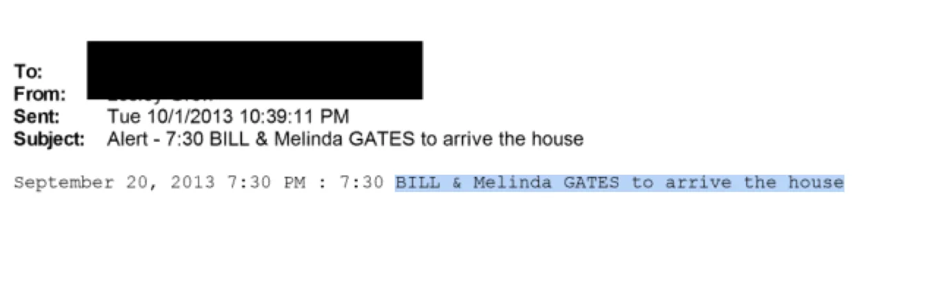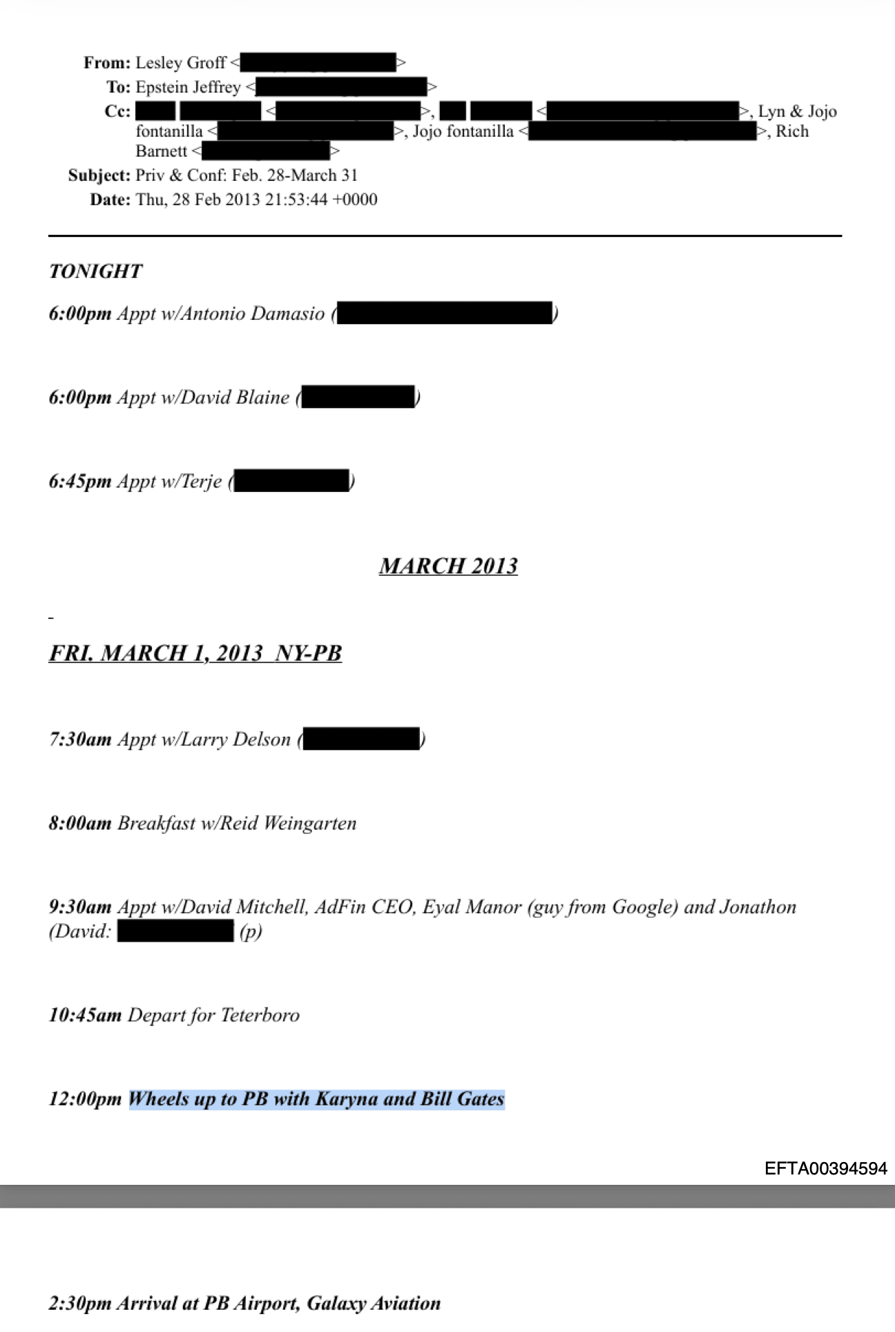 Am 26. Februar 2013 leitete Lesley Groff die Terminplanungsdetails für eine Reise, die am folgenden Mittwoch beginnen sollte, an Epsteins Piloten und Hauspersonal weiter. Zu diesem Zeitpunkt hatten Gates’ Team und Epsteins Team eine koordinierte Logistikoperation aufgebaut: fünf Personen aus beiden Teams, die Terminpläne, Hubschraubertransfers und Bodentransporte verwalteten.