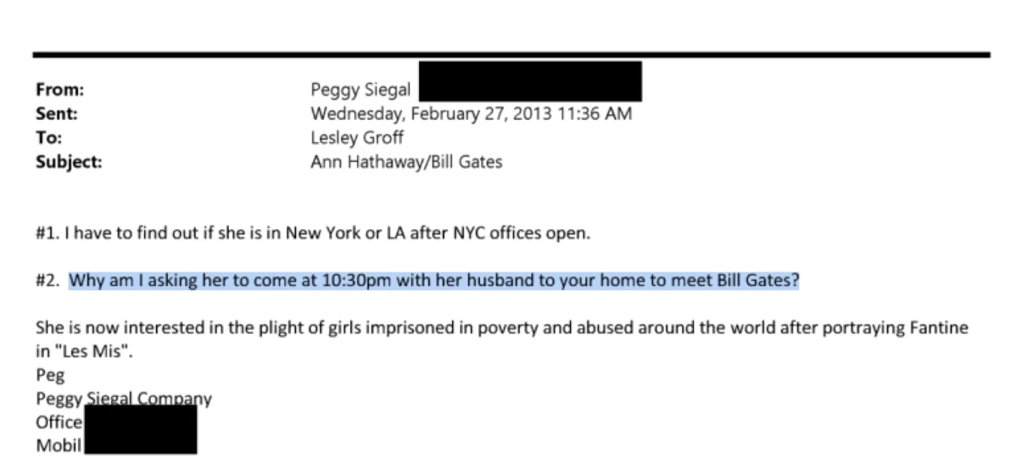 Siegal fragte nicht aus bloßer Neugier. Zwei Tage zuvor war sie gebeten worden, Anne Hathaway und ihren Ehemann um 22:30 Uhr zu Epsteins Haus zu bringen, um Gates zu treffen. Ihre Antwort auf diese Bitte: „Warum bitte ich sie, um 22:30 Uhr mit ihrem Ehemann zu Ihrem Haus zu kommen, um Bill Gates zu treffen?“EFTA_R1_01658692