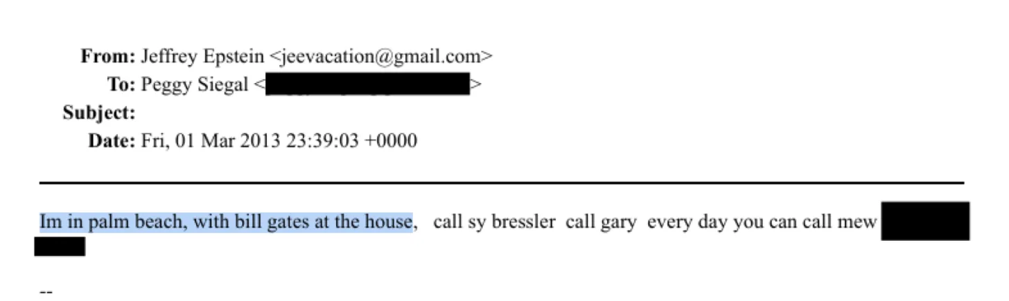 An diesem Abend schrieb Epstein an die Promi-PR-Agentin Peggy Siegal: „Ich bin in Palm Beach, mit Bill Gates im Haus.“EFTA00955261