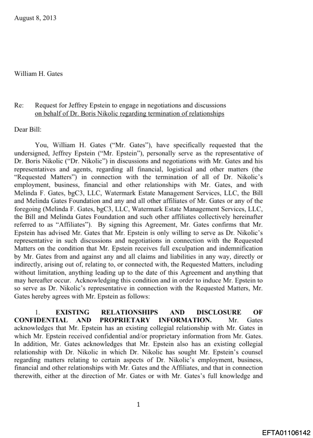 Am 8. August 2013 – fünf Monate nach dem Flug nach Palm Beach, 35 Tage nach der Bestandsaufnahme der Druckmittel, während Epsteins Opfer noch vor dem Bundesgericht um ihr Recht auf Anhörung kämpften – unterzeichnete Gates eine sechsseitige rechtliche Vereinbarung in den bgC3-Büros in Kirkland, Washington.