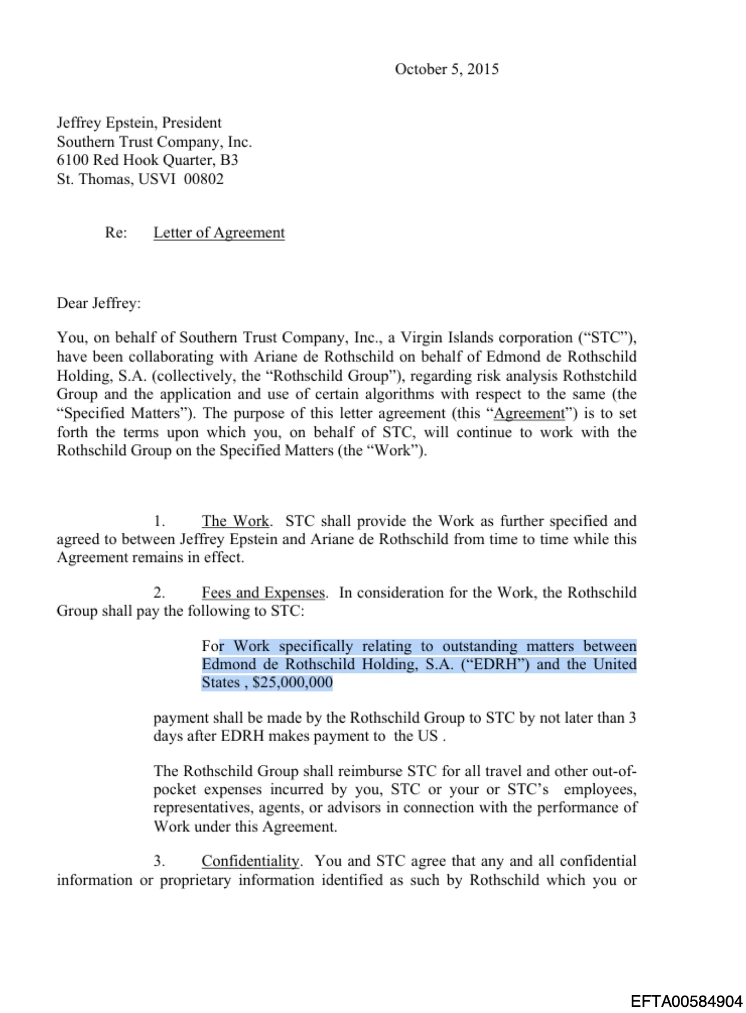 Dann, einen Monat nach Abschluss der Konferenz, im Oktober 2015, wurde eine formelle Vereinbarung zwischen der Southern Trust Company, Inc. – einer von Epsteins beiden Gesellschaften auf den Jungferninseln, denselben Gesellschaften, die in seiner rechtlichen Vereinbarung mit Bill Gates aus dem Jahr 2013 freigestellt wurden – und der Edmond de Rothschild Holding S.A. unterzeichnet. Die Vereinbarung sah eine Gebühr in Höhe von 25 Millionen Dollar im Zusammenhang mit „offenen Angelegenheiten“ vor, die die Regierung der Vereinigten Staaten betrafen. (EFTA00584904)
