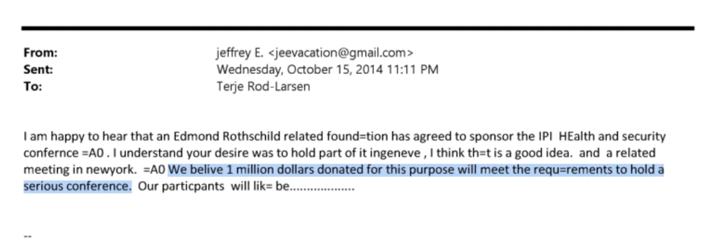 Im Oktober 2014 schrieb Epstein an Rød-Larsen und teilte ihm mit, dass eine mit Edmond de Rothschild verbundene Stiftung zugestimmt habe, die Konferenz zu sponsern. Eine Million Dollar, so berichtete er, würde den Anforderungen für eine seriöse Veranstaltung genügen. Er genehmigte eine Struktur mit zwei Veranstaltungsorten – Genf und New York. (EFTA_R1_01774911; EFTA02592160)