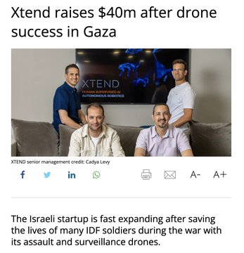 Xtend sicherte sich eine Finanzierung in Höhe von 40 Milliarden Dollar, nachdem es mit seinen Erfolgen im Krieg gegen den Gazastreifen geworben hatte, wo seine Drohnen Granaten abwarfen, Tunnel untersuchten und Palästinenser angriffen. Das israelische Militär setzt seine charakteristische Wolverine-Kampfdrohne in Gaza ein, um Informationen über Gebäude zu sammeln. Die Drohne ist mit einem Roboterarm und einer Virtual-Reality-Brille ausgestattet und entspricht damit der Bedienung eines Videospiels.