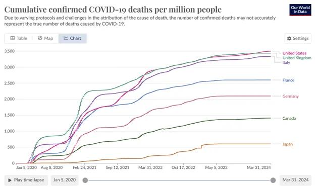 Unsere World In Data zeigt, dass die Vereinigten Staaten im März 2024 mehr COVID-Todesfälle pro Kopf aufweisen als jedes andere Land, fast gleichauf mit Großbritannien und Italien.