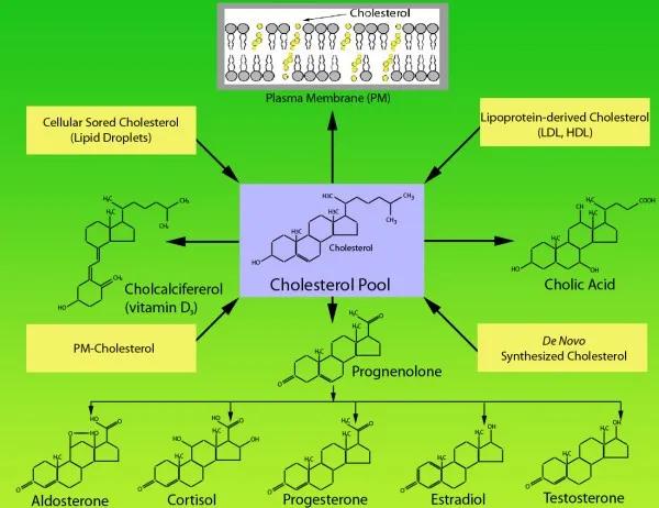 Cholesterin ist die notwendige Quelle für unsere Fortpflanzungshormone, Testosteron, Progesteron und Östrogen, sowie für unsere Glukokortikoide und Mineralokortikoide. Diese Quelle wird in den Keimdrüsen in der Jugend und in den Nebennieren während des gesamten Lebens bereitgestellt. Cholesterin ist also für eine angemessene Funktion der Nebennieren erforderlich.