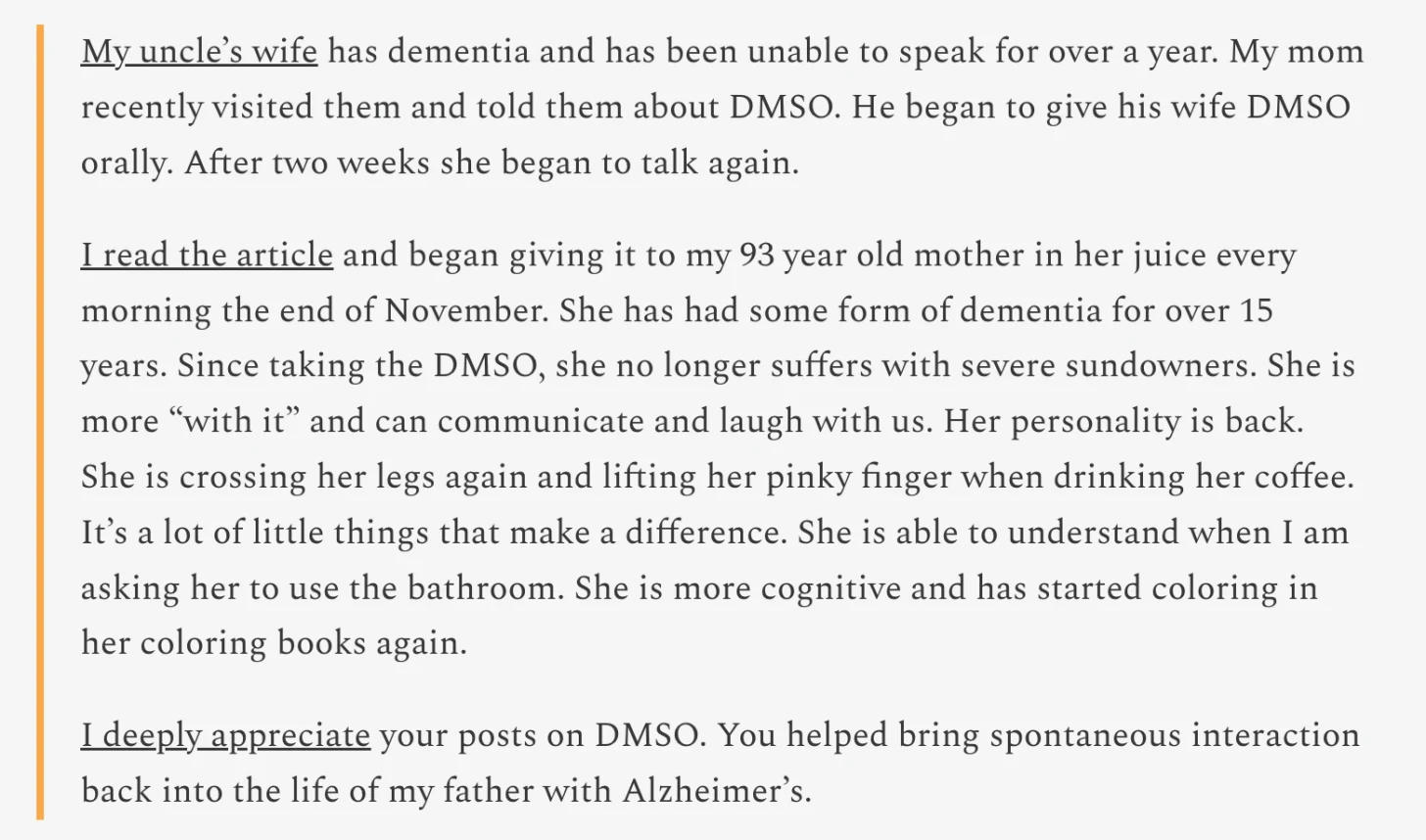 Es ist eine der bemerkenswertesten und am meisten unterdrückten Verbindungen in der Medizingeschichte. DMSO ist dafür bekannt, Hirnverletzungen zu heilen, Entzündungen zu reduzieren, sterbende Neuronen zu retten und das Gedächtnis zu verbessern. Seit Jahrzehnten gibt es Studien, die die Vorteile von DMSO bei Demenz belegen.
