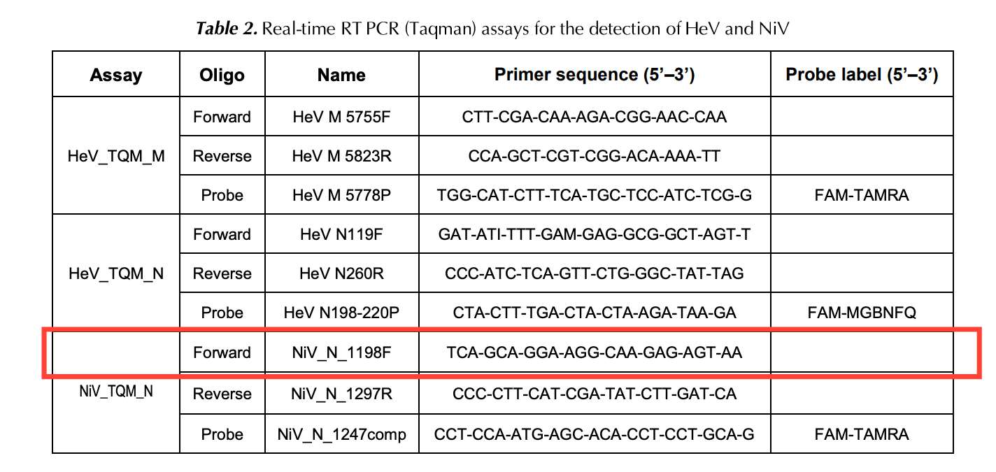 Die betreffende Sequenz ist im Terrestrial Manual der Weltorganisation für Tiergesundheit (OIE) veröffentlicht, in dem ein TaqMan-Echtzeit-RT-PCR-Assay, der auf das N-Gen des Nipah-Virus abzielt, als primäre Diagnosemethode zur Bestätigung klinischer Fälle beschrieben wird.