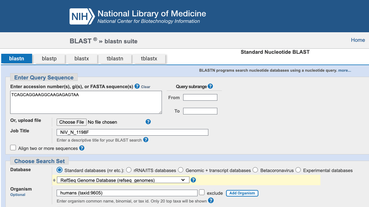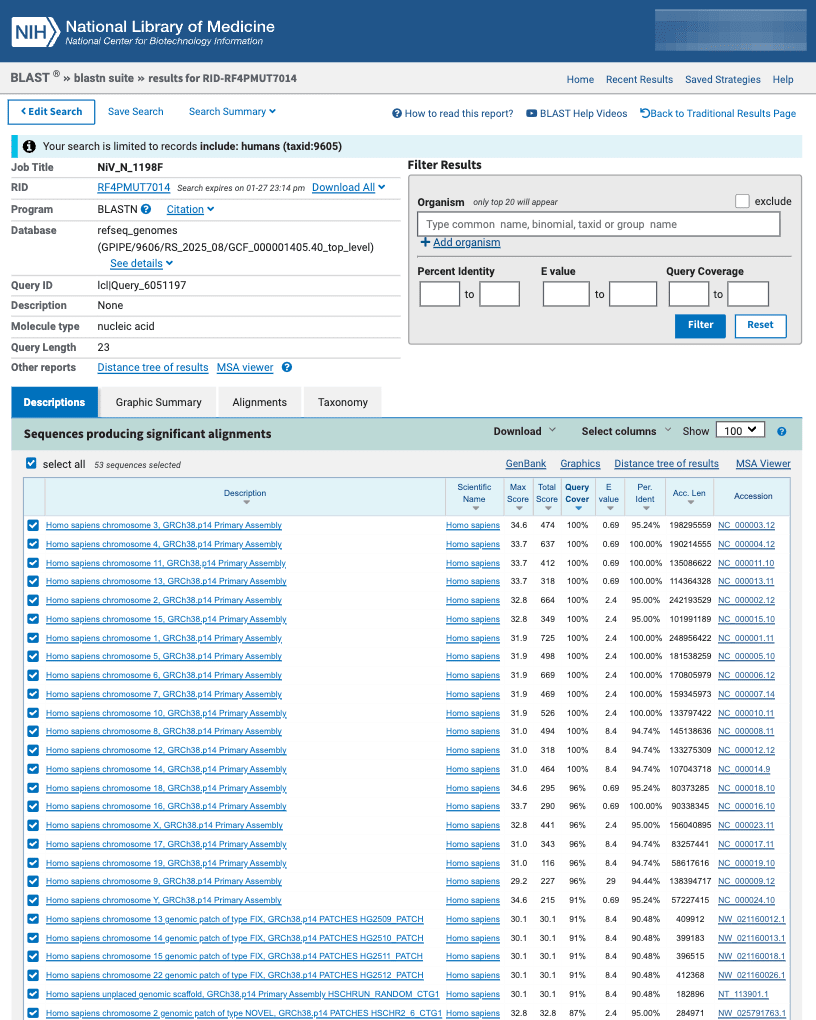 Ich habe jedoch eine BLAST-Ausrichtung von NiV_N_1198F gegenüber dem menschlichen Referenzgenom (GRCh38) durchgeführt, die hochgradig identische Übereinstimmungen über das gesamte Genom hinweg ergab, einschließlich zusammenhängender Übereinstimmungslängen, die den typischen Priming-Schwellenwerten entsprechen, die bei PCR-Reaktionen verwendet werden.