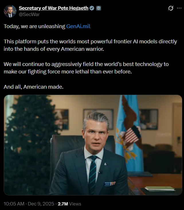 Hegseth und das Kriegsministerium präsentieren GenAI.mil-Plattform für Regierung und Soldaten und erklären: „KI ist Amerikas nächstes Manifest Destiny“