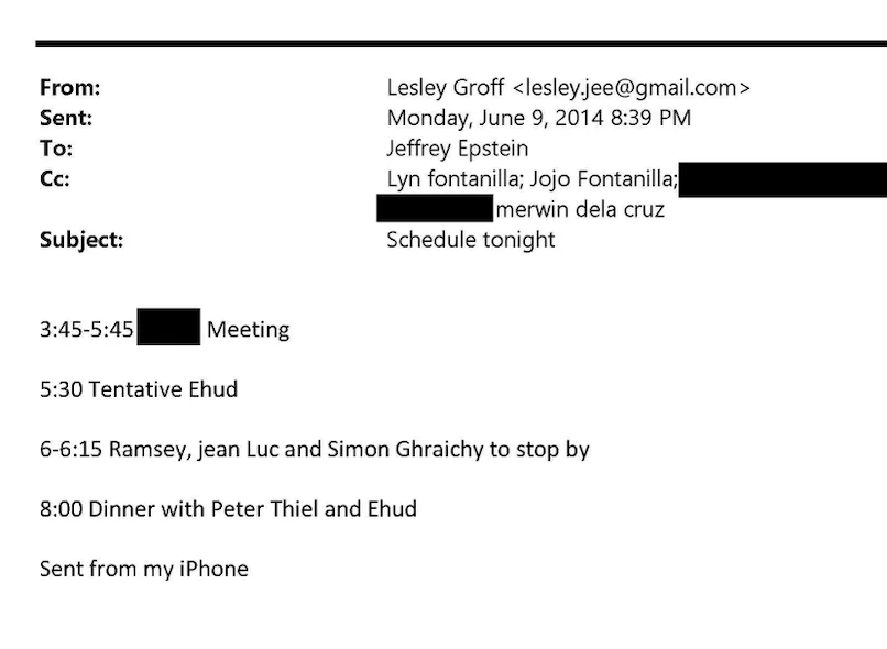 Barak sollte am 10. Juni 2014 in Herzliya sprechen und plante, sich auf der Konferenz mit de Rothschild zu treffen – doch wenige Tage vor Beginn der Konferenz informierte Epstein Barak über kurzfristige Pläne für ein Abendessen mit Peter Thiel am 9. Juni in Epsteins Villa in Manhattan. Barak blieb in New York und sagte sein Treffen mit de Rothschild in Israel ab.
