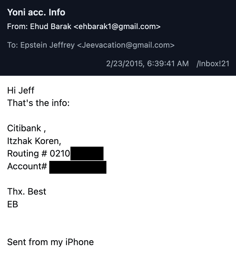 Drei Tage später, am 23. Februar, schickte Barak Epstein eine E-Mail mit dem Titel „Yoni acc. Info“, die die Überweisungsdaten für ein Citibank-Konto namens „Itzhak Koren“ enthielt.