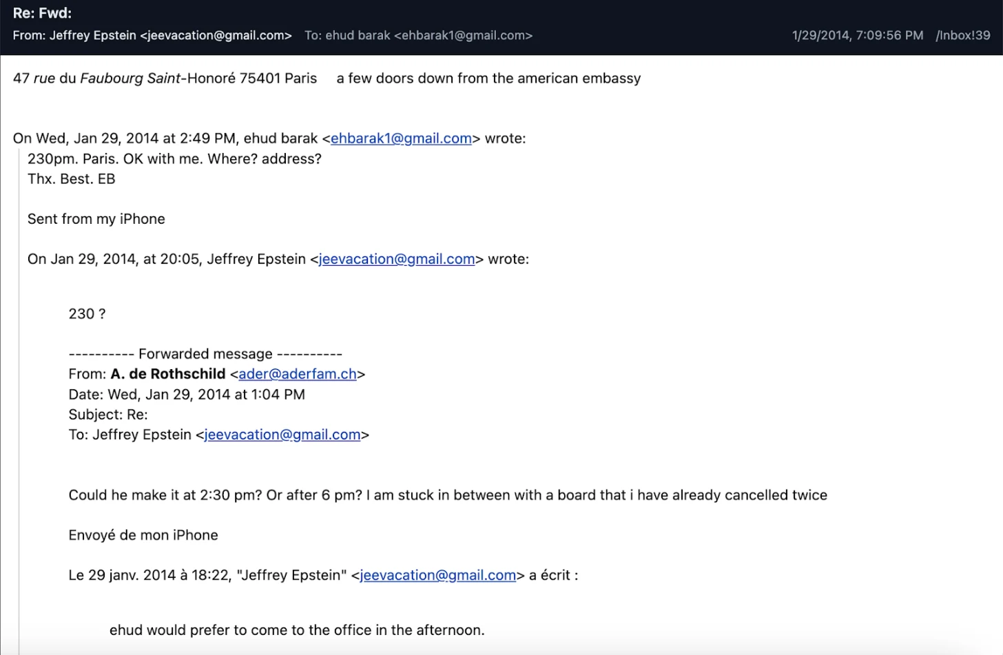 Nachdem er aufgelegt hatte, schickte Epstein sofort eine E-Mail an de Rothschild, um ein Treffen mit Barak zu vereinbaren. Epstein plante ein Frühstück bei de Rothschild zu Hause am 18. Juni. Zuvor schickte Epstein Barak eine private E-Mail, um ihn zu informieren: „Sie hat ein echtes [Problem] mit ihrer [Stiftung] und der israelischen Regierung. Ich brauche 20 Minuten Ihrer Zeit, um Sie zu informieren.“ Nach dem Treffen schrieb Epstein Barak eine Nachricht, um sich über den aktuellen Stand zu informieren: „>?“ Barak bat um eine Telefonnummer, damit sie telefonieren konnten.